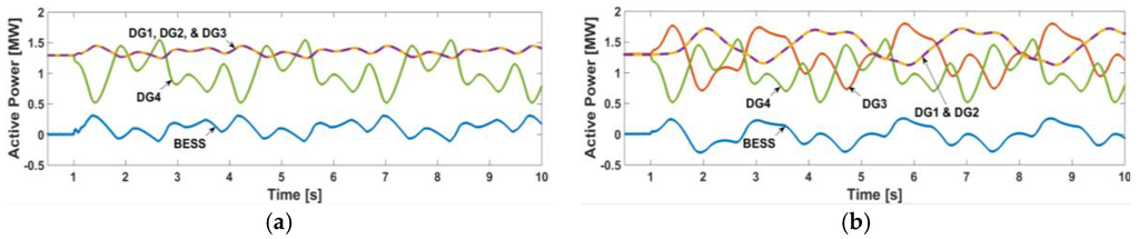 Simulation results of Case 3—Active powers: (a) conventional method; and (b) proposed method.