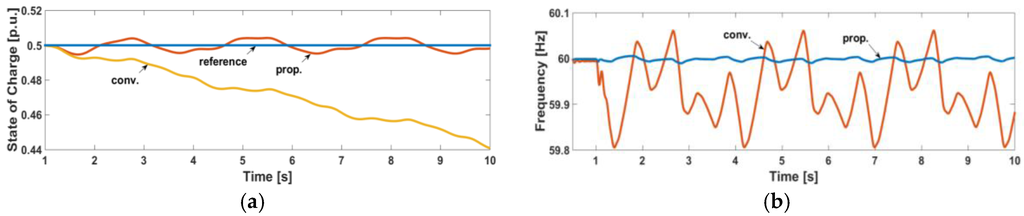 The advantages of the proposed method are clearly shown in Figure 10. It shows the SOC and the frequency comparison between two methods. The conventional method and the proposed method are denoted as conv. and prop., respectively, in the graph. By using the proposed method, the SOC can be maintained near the reference value with a small fluctuation. On the other hand, the SOC is dropped continuously in the conventional method. Figure 10b shows the key result of this study, that is the frequency can be maintained near the nominal value despite of a large fluctuation of the RES power.