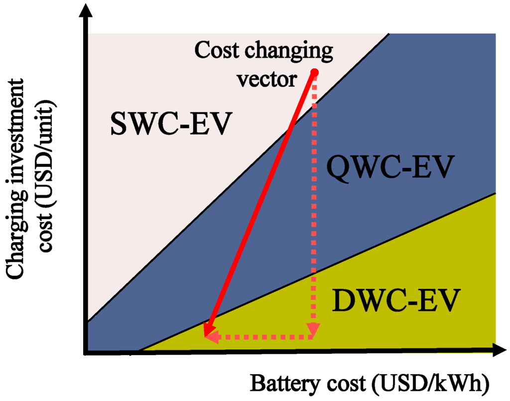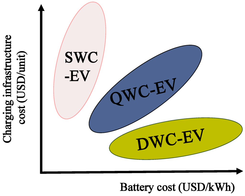 Figure 14 shows a qualitative analysis of the cost trend for the battery-infrastructure cost space based on the finding in the cost sensitivity analysis in the previous section. Note that DWC systems may not be competitive with the SWC or QWC types due to the currently high costs of infrastructure or may not be competitive unless the systems involve greater numbers of EVs. However, considering the past and current trends in technology development, we suggest the movements in cost as depicted in a vector of Figure 14. The rate of the cost decline in batteries has been very sluggish for the last several decades. However, there is a significant opportunity for reducing the cost of the charging infrastructure. Note that as shown in the first panel of Figure 1, the parts for the power tracks are now custom made, and the construction is all done manually. If the parts are mass-produced and if standardized construction methods are introduced, significant cost reductions are expected. As a result, the vector representing the expected cost trend in Figure 14 shows that the costs of infrastructure are expected to decline faster than the costs of batteries. In this paper we provide only qualitative figures concerning the future cost vector. However, it would be interesting to investigate these trends quantitatively. We reserve this study for the future.