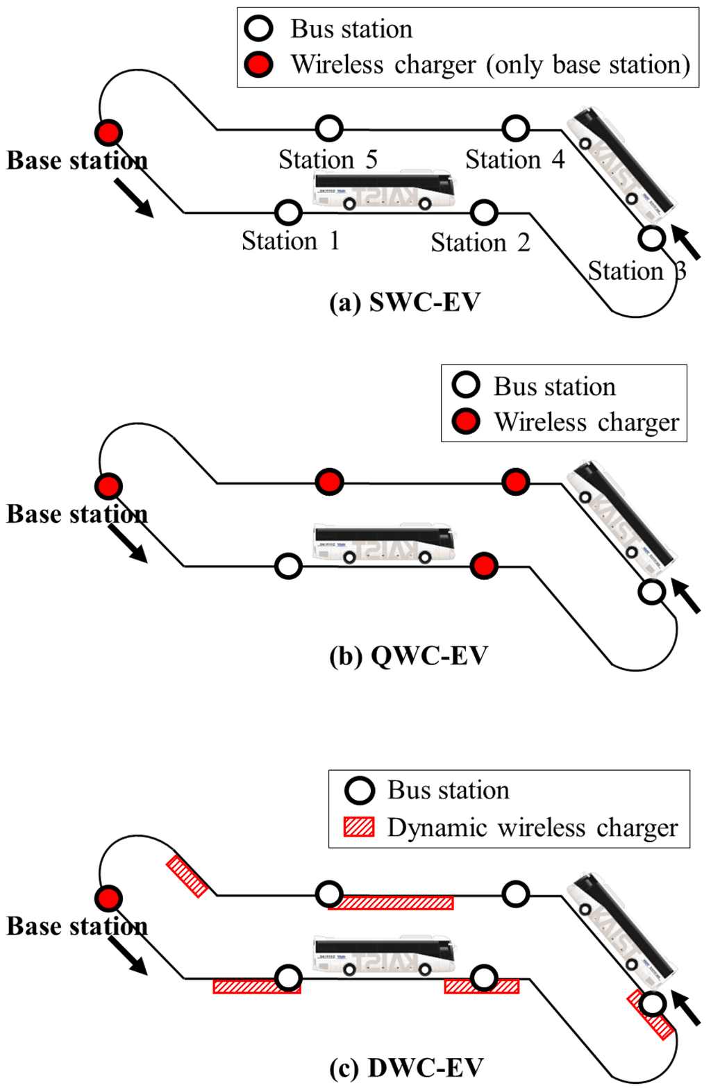 The initial investment costs for three types of EVs are compared. Their charging methods, places and cost structures are described in Table 1. For SWC, the vehicles are charged at the base station, as shown in the first panel in Figure 3. For QWC, depicted in the second panel in Figure 3, the vehicle is charged while it is stationary or in the stop-and-go mode at bus stations. In our analysis, it is assumed that the chargers are installed only at the bus stops and the base station. Identical chargers are installed at the stations. The major investment cost of a QWC-based system consists of the cost of the batteries and the chargers embedded in the bus stations. For DWC, as illustrated in the third panel in Figure 3, charging is done while the vehicle is in motion. Therefore, the charging infrastructure involves “power tracks” that are installed anywhere on the route. The major cost consists of the expense for the batteries and the power tracks. The cost of the power track is broken down into fixed and variable costs. As the cost of the power track is determined by its length, the variable cost indicates the cost of the track per unit of length. Regardless of the track length, one inverter unit (inverter and other components connecting the inverter, power tracks and power grid) needs to be installed for each route. This cost is referred to as the fixed cost.