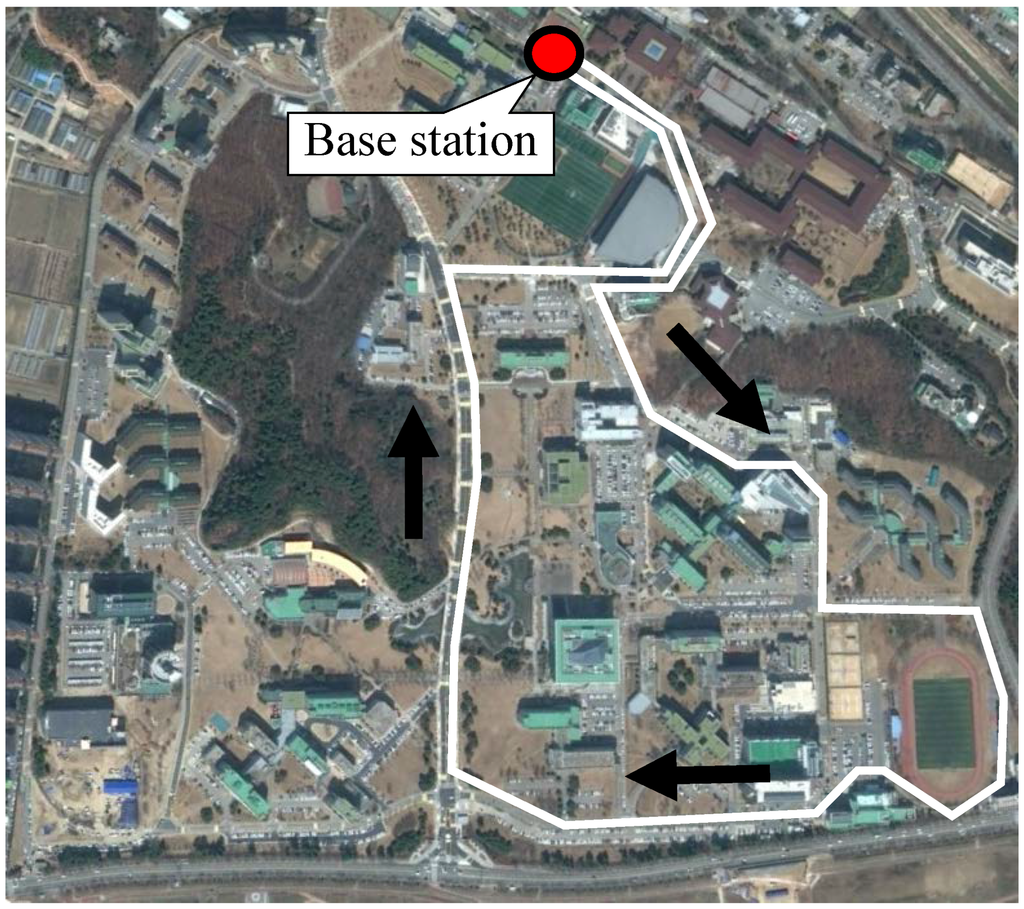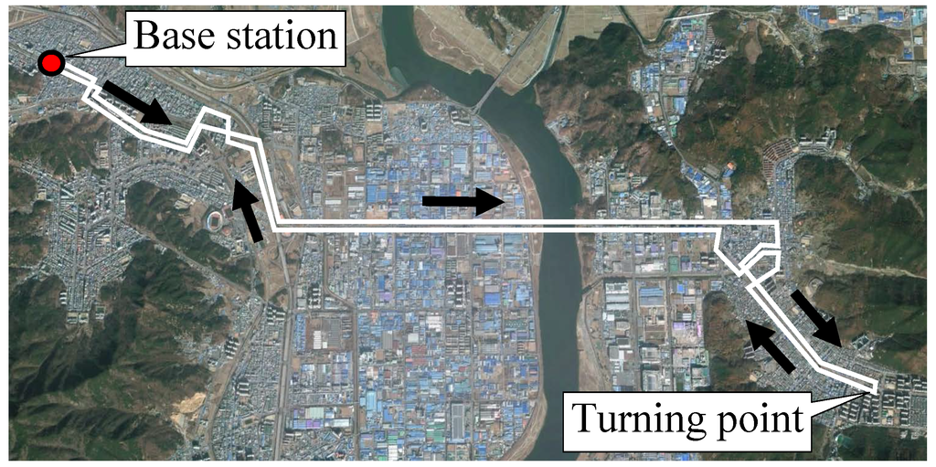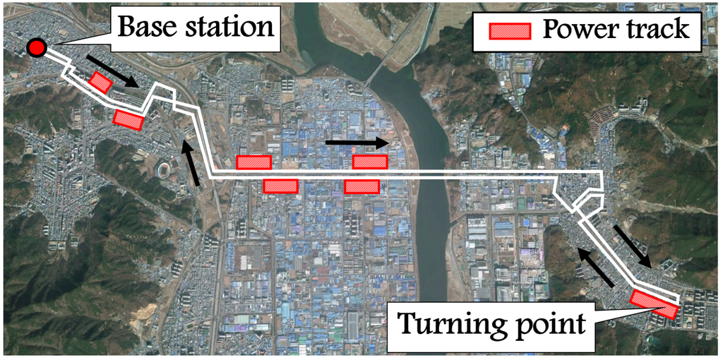 For the initial cost analysis, two scenarios are analyzed—the KAIST campus shuttle and Gumi City urban transit. As the KAIST OLEVs are currently operating for the KAIST campus shuttle and an urban transit route in Gumi City, realistic cost figures and actual data can be utilized in the analysis. For the sake of convenience, the KAIST campus shuttle and the Gumi City urban transit are characterized as “short” and “medium” routing services, respectively, as indicated in Table 2. The KAIST campus route illustrated in Figure 4 circulates a 3.374-km route with eight bus stops. This KAIST shuttle case may represent a transit service for short-travel distances with frequent stops within limited areas, such as theme parks, school bus routes or in-town transit services. For the Gumi City case, as shown in Figure 5, the 34.448-km service route connects the east and west ends of the city through the city center, with 23 stops and a base station.