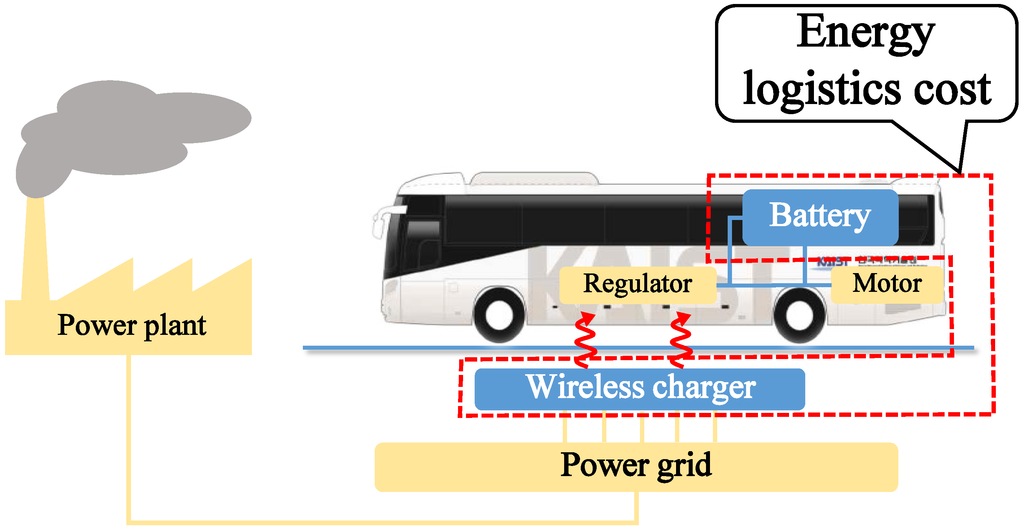 In this section, we provide the method for analyzing the initial investment for each type of EV system. In particular, this analysis is focused on the energy logistics cost in transportation, which is defined as the cost of transferring and storing the energy needed to operate the transportation system. In the domain of EVs for public transit systems, the energy transfer and storage functions are performed by the charging infrastructure and the batteries, respectively. Therefore, the total cost includes the costs of the charging infrastructure and the batteries. In our analysis, we compare the energy logistics cost among the different types of wireless charging EV. Note that the energy logistics cost excludes the cost of generating electric energy and installing the energy grid. The system boundary of the cost analysis is described in Figure 6. We focus on the energy logistics cost in the initial cost analysis for the following reasons.