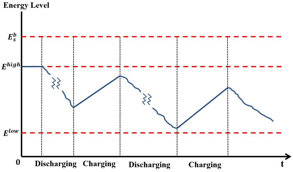 The constraint in Equation (2) is directly related to the size of the battery. Let be the size of the battery for type s. Let and be the maximum and the minimum allowable energy levels in the battery, respectively. These limits are usually provided by the battery manufacturers to help guarantee the required battery life cycle, as the battery’s life is seriously degraded if it is overcharged or over-depleted. Therefore, the required energy levels are defined as: