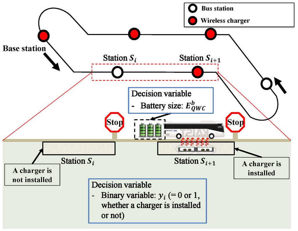 Furthermore, analyzing the costs of QWC and DWC systems is complicated, as the tradeoff between allocations for battery capacity and infrastructure must be considered. One of the key decisions in deploying QWC or DWC EVs for a public transit system is choosing where to allocate the charging infrastructure along the bus lines. The charging infrastructure should be allocated to supply sufficient electric power to the vehicles, and the location of the charging stations determines how frequently the vehicles are charged. This allocation should also be considered relative to the battery size. It should be noted that the battery capacity determines the maximum amount of energy that can be stored. If the battery capacity is low, the per-charging distance (or the maximum distance that the EV can travel on a fully-charged battery) will be short. Consequently, more frequent charging is required for smaller batteries, and a greater density of charging stations must be distributed along the routes. Therefore, in planning for a QWC or DWC-based transit system, the issue of charging infrastructure allocation should be considered together with the size of the batteries.