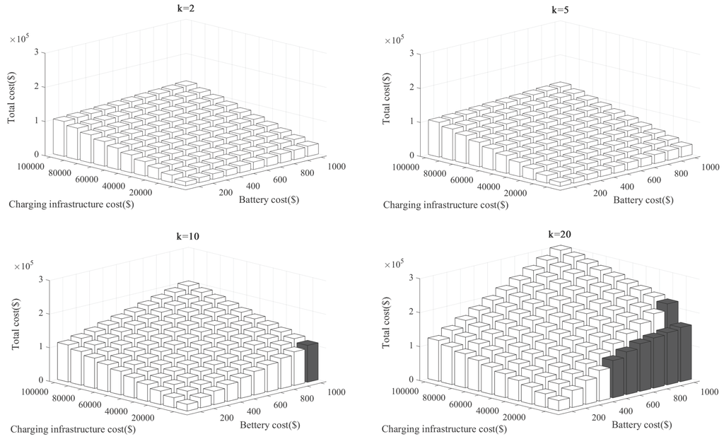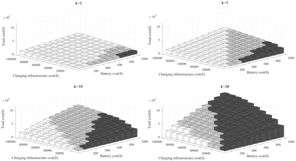 Figure 11 shows the three dimensional bar graphs of for different values of and for the Gumi City case. For each graph, the x- and y-axes represent the battery cost coefficient () and the charging infrastructure cost efficiency (), respectively. The z-axis represents the minimum investment cost , which shows the most economical EV type for the corresponding battery and infrastructure cost coefficients. The numerical values presented in Figure 11 are shown in the Appendix in the supplementary document. In each graph, white bars are shown if the most economical solution is the SWC type. The gray and black bars represent cases where the most economical solutions are QWC and DWC, respectively. As illustrated, when the cost of the battery is high and the infrastructure cost is low, the DWC type is the most competitive solution. On the contrary, if the infrastructure cost is high and the battery cost is low, the SWC type is more competitive. This result is well aligned with the qualitative speculation illustrated in Figure 2. As the battery cost becomes more expensive (given that the infrastructure cost remains the same), the DWC type becomes more economical, as the DWC needs a relatively smaller battery than the SWC type. However, if the battery cost remains the same, but the infrastructure cost increases, the SWC type becomes more attractive, as SWC requires the least expensive charging infrastructure among the three types. As expected, the economical space for QWC is located between the SWC and DWC spaces. For comparison among the different k’s, as the number of EVs in the fleet gets larger, the DWC type grows more favorable. In this case, the total cost of the batteries for the vehicles increases as the cost-benefit of the charging infrastructure gets larger, because the charging infrastructure is shared with a greater number of vehicles. Figure 12 shows a similar analysis performed for the KAIST shuttle case. The numerical values are presented in the Appendix in the supplementary document. For most of the cost scenarios, the SWC type is the most economical, because the service route is short and a small battery can hold enough power to complete a service without recharging. Interestingly, the DWC type becomes cost-effective when the number of EVs is more than 19. However, the QWC type is never shown as the most competitive solution. In practice, it may not make sense to run 19 or more EVs for such a short route (note that as mentioned earlier, the KAIST OLEV on the KAIST campus was installed mainly to validate the reliability of the system). Interestingly, some researchers argue that DWC is the more economical solution for short routing services, such as those for the KAIST campus or for trolleys in theme parks [6]. However, with the results we obtain, we do not see any benefit from DWC with the current cost structure. Rather, DWC is a more economical solution for medium-range service, as in the Gumi City case. We discuss this issue in the next section.