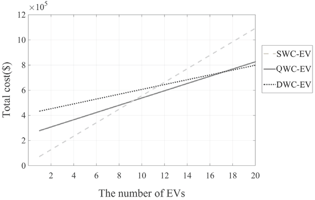 For the DWC case in Figure 13, the rate of cost increase is relatively smaller than that for the SWC case. For a DWC system, a growing number of EVs serves to increase optimization, so that smaller batteries are more economical. Then, through using smaller batteries, the rate of change in cost against k decreases. Note that when and , the cost lines for SWC-QWC and for QWC-DWC cross, respectively. That is, if k is less than nine, SWC is competitive; if k is between nine and 17, QWC is competitive; and if k is greater than 17, DWC is the most economical. The lines with lower costs (SWC for , QWC for and DWC for ) can be considered a lower bound for the wireless charging EV regardless of the charging type.
