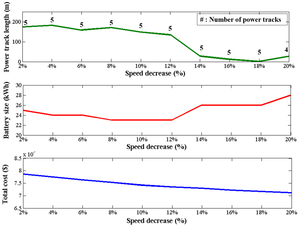 As the speed is reduced, the amount of charge per length is increased, and therefore, the total length of the power track is reduced, as shown in the first panel in Figure 15. Interestingly, the battery size increases slightly, as shown in the second panel. Overall, the total cost gradually drops as indicated in the third panel in Figure 15.