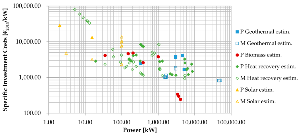 Figure 1 displays a review of published data on estimated ORC investment costs. The specific investment costs (SIC) are presented as a function of capacity, plotted on a log-log scale for better representation. Within the scope of this paper, only papers that estimate ORC investment costs have been included. The following selection criteria were applied: (a) the paper performs a bottom-up estimate of ORC costs, using various techniques; (b) the power output of the ORC system is given and (c) the paper presents the resulting SIC or the total investment costs of the ORC system. This implies that Figure 1 includes no real ORC costs and that cost estimates with incomplete information could not be incorporated. The data has been categorized according to the scope of the system and the heat source. The scope refers to either an ORC module (M), which comprises only the essential components of the ORC itself without integration or installation, or an ORC project (P), including all expenses needed to integrate and install the ORC module into an existing plant or with the fuel conversion equipment. The heat sources are classified into the four groups geothermal, biomass, heat recovery, and solar. To allow for comparison, the costs are converted to euros and updated to 2014 values, using the Chemical Engineering Plant Cost Index (CEPCI). Figure 1 plots the results; suggesting decreasing SIC for increasing power output. These findings are in line with the trend reported by Quoilin et al. [45]. Scattering of the data for similar power outputs is due to different ORC designs, system delineations and estimation approaches. Solar ORC systems are most reported for smaller capacities, whereas geothermal systems are commonly larger scaled. The solar ORCs tend to have higher SICs, with an average of 21 k€2014/kW for the projects and 7.4 k€2014/kW for the modules. The estimated geothermal ORCs have an average SIC of 3156 €2014/kW for complete projects and 1149 €2014/kW for modules. The heat recovery ORC systems are more represented in the middle range, with estimated module costs around 2781 €2014/kW (Average calculated excluding the micro-scale diesel engine recovery ORC systems of Yang et al. [46]. Including these gives an average heat recovery module SIC of 12,149 €2014/kW.) and averaging project costs of 3414 €2014/kW. Note that the lower costs for modules than for projects are the result of averaging, but the result is in line with the finding that there are less distinct differences between module and project costs. No biomass modules are included in the data, but biomass projects are estimated in the same order of magnitude (3054 €2014/kW) as heat recovery systems. Recall that all the values in the graph and these averages are the result of estimates, where different estimations methods and scopes are used. These do not necessarily reflect real ORC system costs and should not be generalized as such.