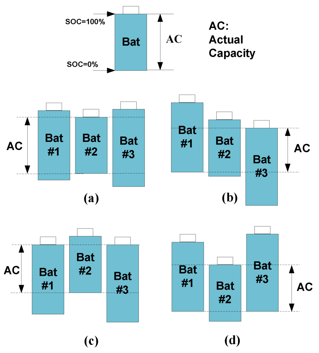 Figure 1a shows capacity differences in a pack, Figure 1b–d shows that SOC differences further aggravate the inconsistency level. As shown in Figure 1a, when the minimum battery is the first one to be fully charged and discharged, the actual capacity of the pack is the minimum battery’s capacity. Batteries in this pack do not need to be balanced, but the capacity is limited to the minimum battery. Otherwise, if the minimum battery isn’t the first one to be fully charged or discharged due to SOC differences as shown in Figure 1b–d, actual available capacity is even less than the minimum capacity of all the batteries in a pack. Passive equalization of the battery pack can solve the problem of SOC differences but has no effect on capacity differences [].