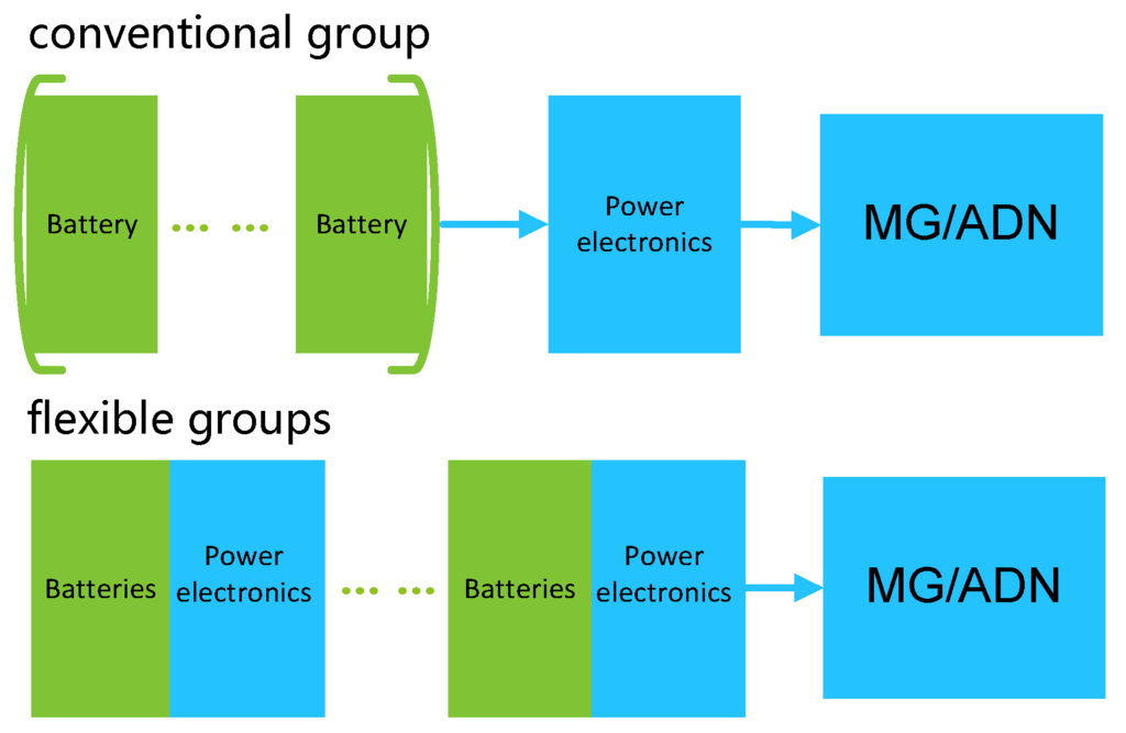A cluster of N batteries serially connected can be divided into n low-voltage battery packs through power electronics []. In this way, a conventional group of batteries connected with a high-power converter is shifted to multiple flexible groups. A flexible group integrates several batteries and a low-power converter into a module as shown in Figure 2. The power converter can be a DC/DC or a DC/AC converter to realize individual power control of each low-voltage battery pack. A certain number of modules can be cascaded or parallel-connected to a DC bus or AC bus.