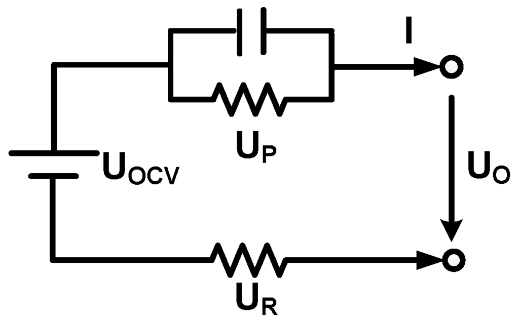 A typical battery model is shown in Figure 3. UOCV is the open circuit voltage, UR and UP are ohmic voltage drop and polarization voltage, respectively. UO(terminal voltage) reaches the cut-off voltage ahead of UOCV because of UR and UP, which means that the battery will not be fully charged/discharged. However, this problem can be solved through changing current to rather small (e.g., 0.1 C) at the end of charge/discharge; thus, the voltage drop UR and UP can be neglected and the battery can approximately be regarded as fully charged/discharged. In this case, depth of discharge (DOD) is approximately 100% and the maximum available capacity of the battery can be fully used [,].