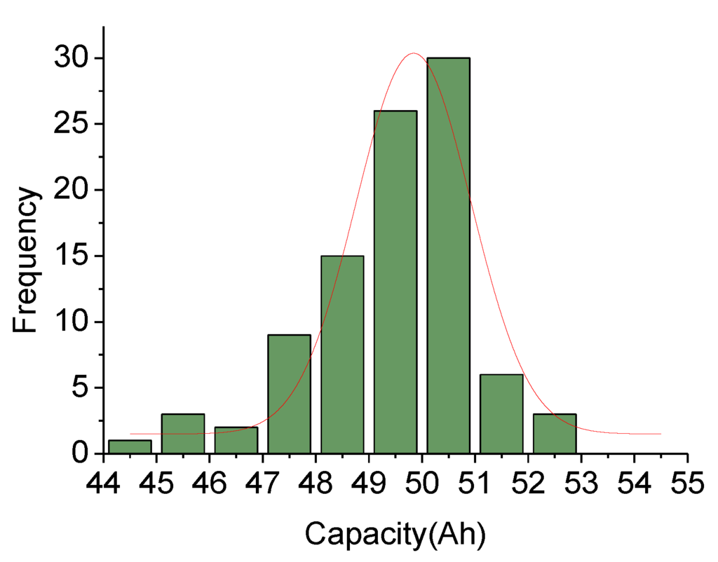 Figure 4 shows a group of data from LiFePO4 batteries which have been cycled for about 1500 times. The capacities have deteriorated from the original rated 60 Ah to a distribution of mean 49.46 Ah and standard deviation 1.499 Ah after three years of service, which shows approximately Gaussian distribution characteristics. The energy utilization efficiency is analyzed based on these experimental data.