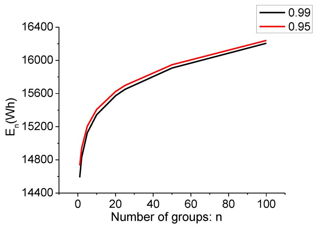 Assume that there are N = 100 batteries in total. All of the batteries are randomly grouped instead of deliberately screened. Figure 5 shows the relationship between En and the number of groups (n) where probability α is 0.95 and 0.99, respectively, based on data mentioned in Section 2.1. Under given capacity distribution, En rises with n increasing as expected. However, when n is larger than approximately five, the increasing speed of En begins to go down.