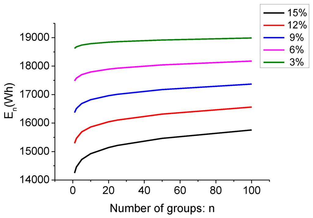 During the process of utilization, the mean of capacity and the inconsistency level are gradually changing. Reference [] showed that the discrepancies among batteries were increasing with aging spread which had a major influence on the energy utilization as well as lifetime. Within the life cycle, assume that the mean of the capacity among all the batteries deteriorates from 100% to 80% of nominal value and the inconsistency level increases from 0 to 15% of capacity as shown in Table 1. This changing process is taken as linear and the data still fits a Gaussian distribution. Figure 6 shows En under different capacity inconsistency levels. From the slopes of these curves, it can be concluded that when the inconsistency level is higher, dividing the 100 batteries into more groups has a more significant impact on En.