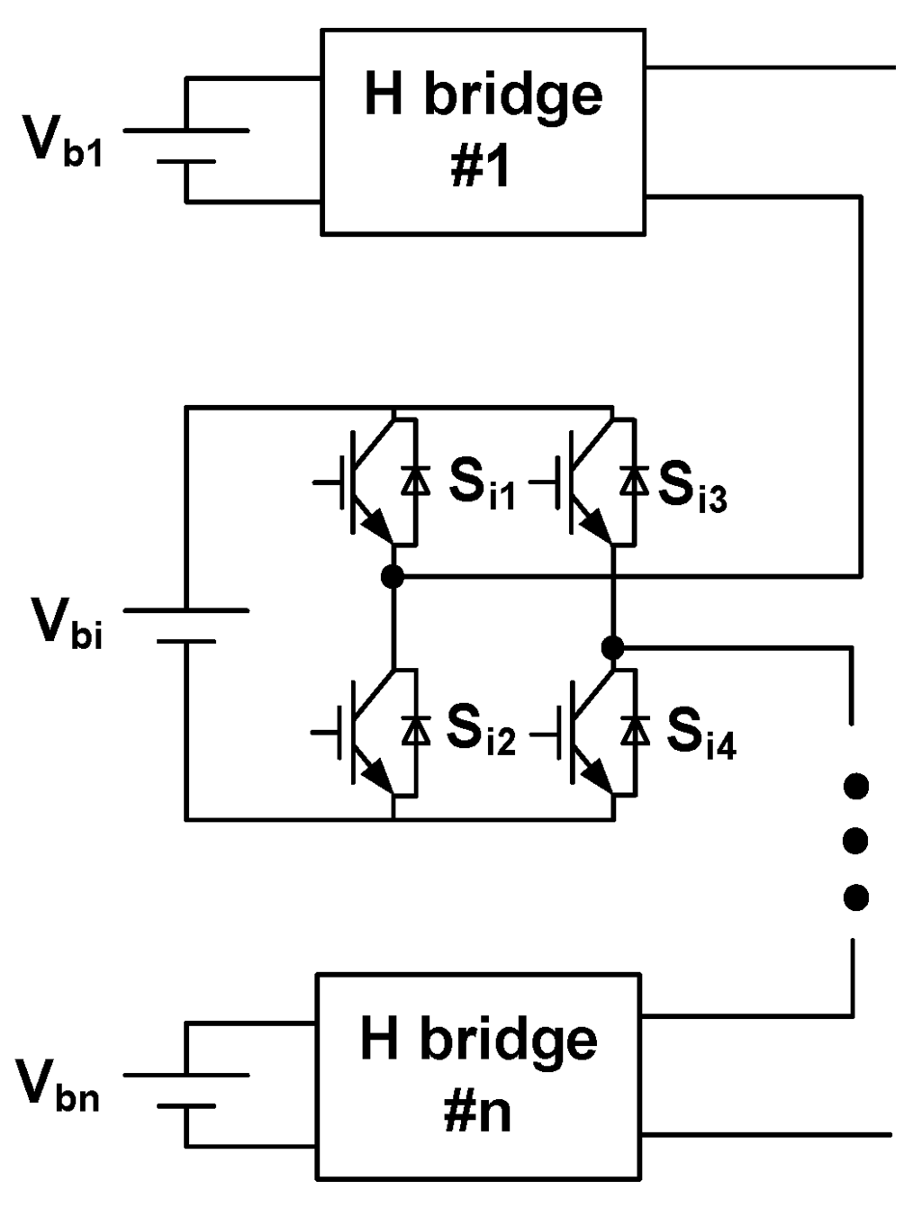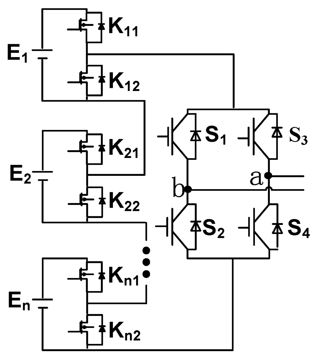 Some other topologies have been proposed with fewer switches to realize lower loss of semiconductor devices. The most popular one is the multilevel DC link inverter presented in [] as shown in Figure 8. The number of conduction switches is n + 2, which is less than H-bridge converter when n > 2. Other topologies, such as in [,], have n + 1 and 1.5n conduction switches, respectively. However, these two topologies are not modular enough to realize easy control. In this paper, the H-bridge converter is cited to calculate the efficiency.