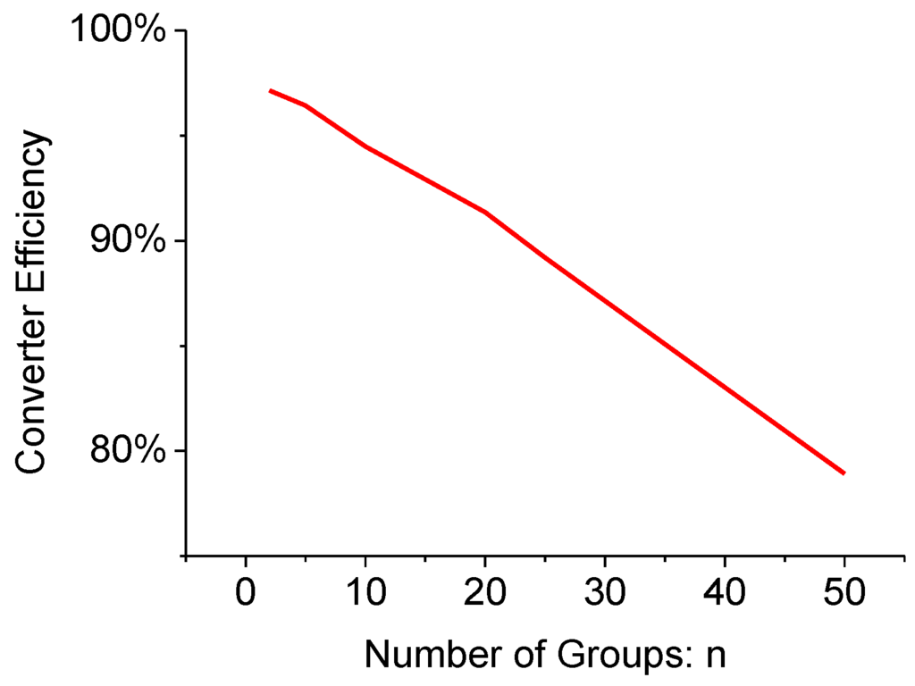 As mentioned in Section 2, there are 100 batteries in total. Discharging current is 2 C (100 A). According to Equation (28), RMS current of the AC side is 168 A. Module parameters and loss calculation are shown in Table 3. The efficiency with different numbers of groups is illustrated in Figure 9. As the number of groups goes up, converter efficiency decreases because there are more semiconductors, which cause more loss.