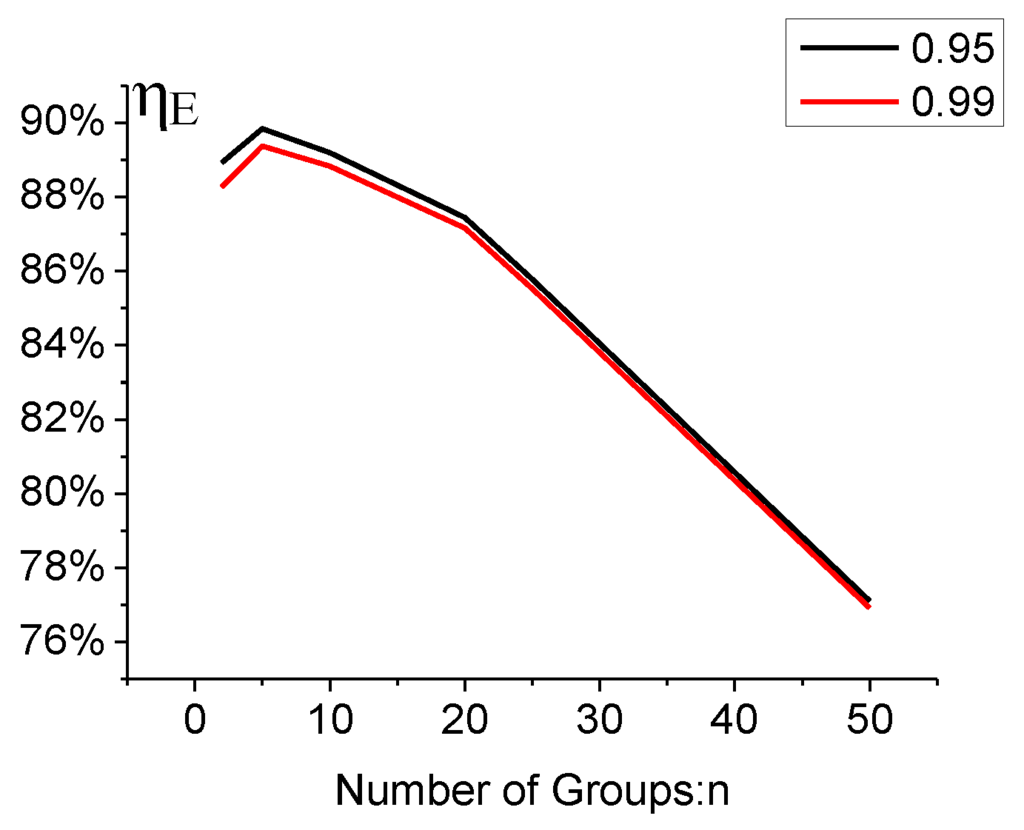 As shown in Figure 10, based on the retired battery data mentioned in Section 2.1 (with a mean value of 49.46 Ah and standard deviation of 1.499 Ah) where probability α is 0.95 and 0.99, respectively, ηE is the maximum when the number of groups is five. Maximum energy utilization efficiency of this retired battery sample is approximately 90%.