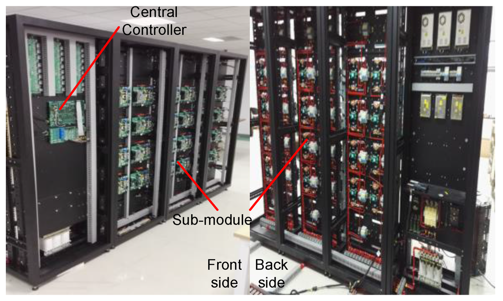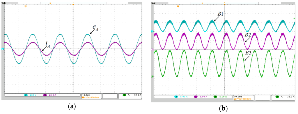 Figure 11 shows a picture of the prototype in which basic power control has been implemented. The power factor is 1 in phase A as in Figure 12a. Figure 12b shows the battery current waveforms of each module in phase B, where the DC component of current in each module of phase B is 2.883 A, 4.535 A, and 7.283 A, respectively. Individual power control is realized in the BESS, which shows the feasibility and flexibility of the prototype.