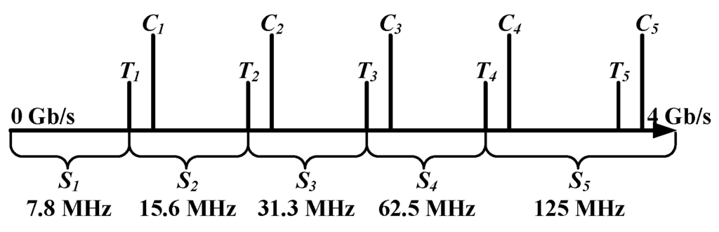 Due to the finite queue size, the STP is to assess an associated traffic throughput threshold beyond which the router will begin to loss packets for each operating frequency. Table 1 presents the mapping table of operating frequencies, capacity states, measured capacities and preset thresholds for STP. As shown in Figure 4, the capacity states S, S, S, S and S represent the routing capacities of the FSR working at core operating frequencies of 7.8 MHz, 15.6 MHz, 31.3 MHz, 62.5 MHz and 125 MHz, respectively. C represents the peak measured throughput for each capacity state S. At 125 MHz, the peak measured throughput C is below the theoretical full operation throughput 4 Gb/s, which is the maximum throughput for the NetFPGA router. For each capacity state S, the threshold T should not be preset too aggressively and too close to C. Because the statistics monitoring is implemented by counting bytes at a fixed sampling period and the statistics may vary slightly from time to time, thus T must be set lower than C, and experiments indicate that a reasonable value for T is 95% of C. A level of 95% was chosen for consistency with prior work on ALR [1], as was the 10-ms sampling period. The choice of these parameters involves a trade-off between energy savings and packet loss.