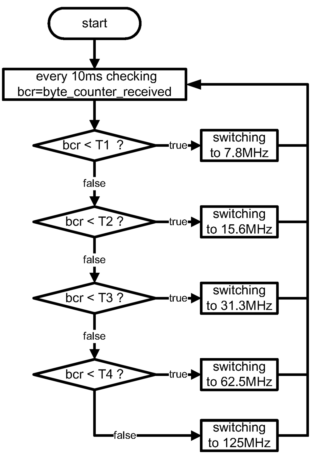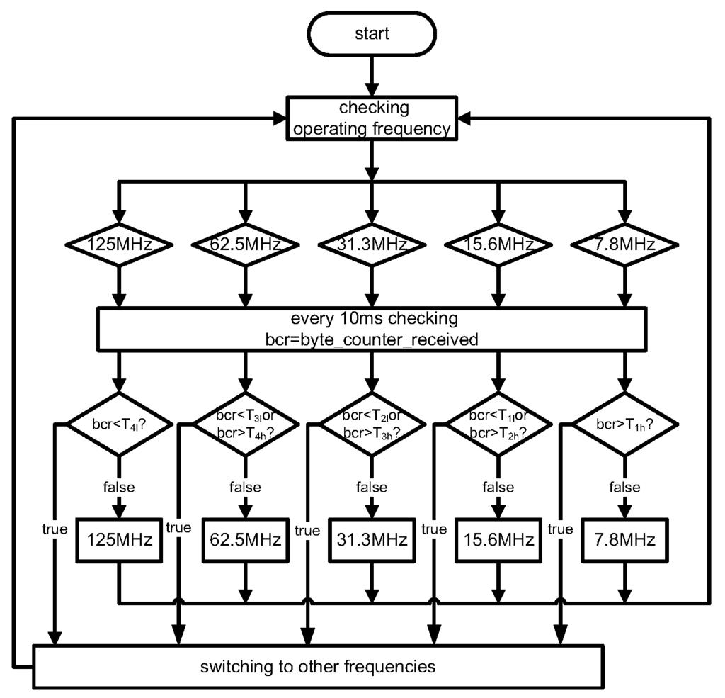 As shown in Figure 3, statistics monitoring and preset thresholds are adopted in the design of the frequency control policies of the proposed energy-efficient FSR. The statistics monitoring is designed to indicate the current core logic frequency, the total number of bytes received from all receive queues (byte_counter_received) and the total number of bytes dropped from all output queues (byte_counter_dropped) in a certain sampling period. The sampling period is extremely sensitive, because it directly determines the delay between the request for a new frequency and the actual frequency transition. Experimental results indicate that 10 ms is a reasonable interval time for the sampling period and is consistent with that used in implementing ALR [1]. The preset thresholds are adopted to divide the routing capacity into five grades in response to the incoming traffic load in the previous 10-ms sampling period. Different frequency control policies may have a different set of rules for setting the thresholds.