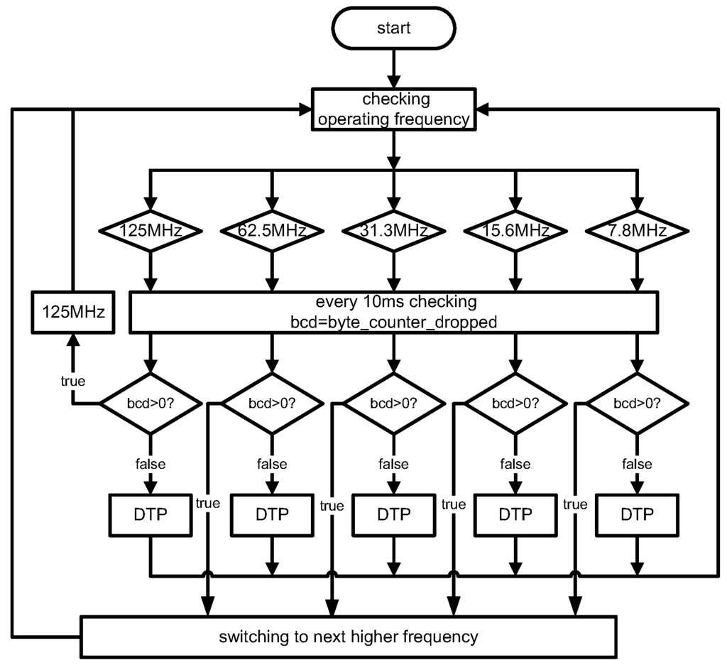 To eliminate these deficiencies associated with threshold-based policies, a packet loss-aware policy is introduced. The only criterion of PLAP to switch to a higher frequency is when packet loss is detected. The PLAP cannot be used standalone; it can be used in conjunction with DTP to deal with frequency scaling up scenarios; the operating frequency can be switched to a higher level as soon as the processing engine detects any packet loss. This scaling up is following a level-by-level mechanism, which means that switching only appears between adjacent frequency levels regardless of the fixed preset thresholds to minimize the transition overheads for extremely fluctuating traffic scenarios. DTP controls frequency scaling down scenarios. Figure 8 presents the flowchart of the PLAP.