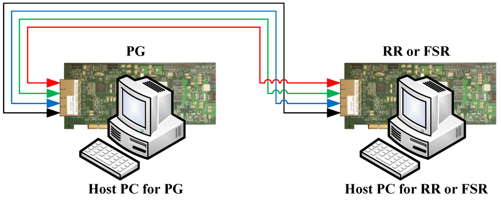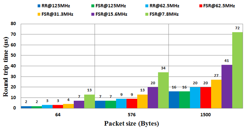 In the RTT measurements, the experimental setup is somewhat different from the lab setup in Figure 9. All four ports are used to measure the RTT: two ports of the PG are connected directly to one another, and the RTT is measured to provide a baseline RTT reference as RTT0; the other two ports of the PG are connected to the RR or the FSR under test; and the RTT is measured as RTT1. The RTT is calculated as the difference between RTT1 and RTT0. Figure 12 reports the RTT of the RR and the FSR under different operating frequencies and different packet sizes. Experimental results indicate that a higher operating frequency and a smaller packet size could give rise to a shorter round trip time. Compared to the smaller-sized packet, the larger-sized packet has a longer RTT because it takes longer time to buffer and process. For example, a packet 64 bytes long has a 2 µs RTT, while a packet 1500 bytes long has a 16 µs RTT with the same operating frequency of 125 MHz for the RR.