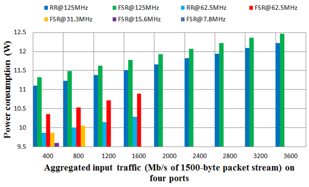 We start with measuring the power consumption of the RR and the FSR in idle state when the board is configured as the RR or the FSR, but without routing any traffic. To evaluate the impact of the operating frequency and the number of active ports on the power consumption, the RR bit file and the FSR bit file are, in turn, downloaded into the core logic FPGA processor and configured as an RR and an FSR for comparison. The four Ethernet ports are activated one by one, and the power consumption of the RR and the FSR is measured at their allowed operating frequencies. The measurement results show that the power consumption of a router is proportional to the number of active ports, with approximately 1 W additional power consumption for each activated port.