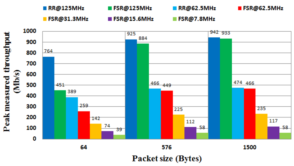 To evaluate the impact of the operating frequency and the traffic characteristics on the performance, the link capacity is one of the most important metrics to be firstly measured. Link capacity is also known as the peak measured throughput. Figure 11 presents the link capacity of the RR and the FSR under different operating frequencies and different typical packet sizes. Experimental results show that a higher operating frequency and a larger packet size could lead to higher link capacity. A higher frequency produces more cycles per second to fit more data in per second, and it thus provides higher routing capacity. Due to the less overhead incurred by packet head processing, a larger packet size typically means higher routing capacity for routers, or lower power consumption, or both. Therefore, it is advisable to use larger packet sizes whenever possible.