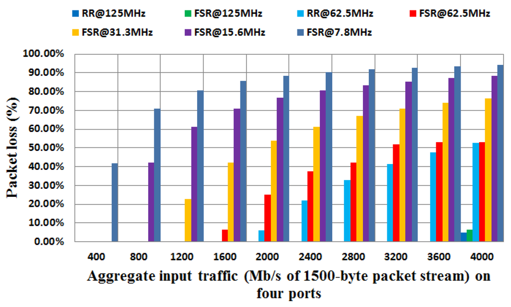 The traffic characteristics and the operating frequency also affect the packet loss. Figure 13 presents the packet loss of the RR and the FSR under the same 1500-byte packet stream with different operating frequencies and different aggregated input traffic bit rates. Experimental results indicate that, for both the RR and the FSR, the packet loss is proportional to the traffic bit rate. Besides, a higher operating frequency could result in lower packet loss.