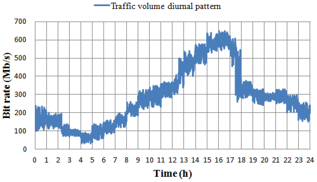 To evaluate the proposed FSR, real traces with an application mix of Transmission Control Protocol (TCP) and User Datagram Protocol (UDP) traffic (including the Internet’s most popular applications, Hypertext Transfer Protocol (HTTP), File Transfer Protocol (FTP), email, Domain Name System (DNS), Simple Network Management Protocol (SNMP), streaming media, etc.) were captured from a border router in the Dublin City University campus network. Figure 14 shows a clear link traffic volume diurnal pattern. In this diurnal pattern, the maximum traffic bit rate is approaching 649 Mb/s between 16:00 and 17:00, and the average traffic bit rate is about 280 Mb/s.