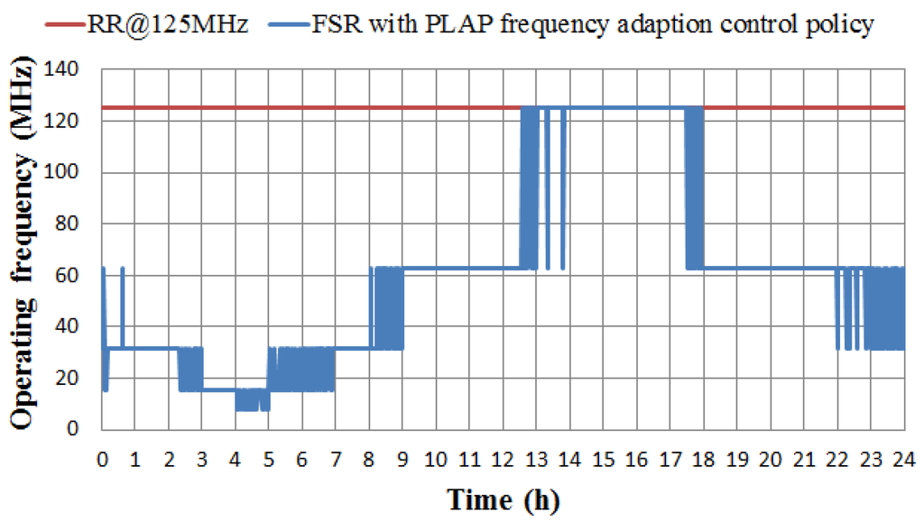 If a fixed operating frequency is used throughout the day, a high frequency will ensure negligible packet loss, even during the peak period from 15:00 to 17:00 h in Figure 14, at the expense of high energy consumption. Adapting the frequency in accordance with one of the control policies described in Section 4 results in considerable energy savings. The resulting graph of operating frequency vs. time is shown in Figure 15 for the PLAP policy. Broadly similar results were obtained for the other two policies. The aggregate duration in each frequency mode for different control policies is shown in Table 5. The second highest available operating frequency (62.5 MHz) was selected for an aggregate of just less than ten hours during the day and the highest frequency (125 MHz) for about four and a half hours. Lower frequencies were needed for the remaining nine and a half hours of the day. This results in a significant power savings. The resulting power savings are shown in Table 6.