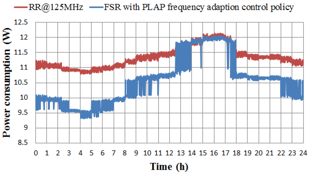 Figure 16 depicts the corresponding power consumption of the RR and the FSR for the day. Since the RR is running at the fixed frequency of 125 MHz, the power consumption of the RR (the upper red curve) fluctuates only in response to the traffic characteristics. However, the power consumption of the FSR (the lower blue curve) fluctuates sharply due to the fact that, in the FSR, both traffic characteristics and operating frequencies affect the power consumption. The difference between these two curves reveals the power savings from the DFS technique, which indicates that the FSR dynamically scales the operating frequency of the core FPGA processor among five different frequencies in response to the instantaneous traffic load, rather than leaving network routers running at the highest frequency all of the time.