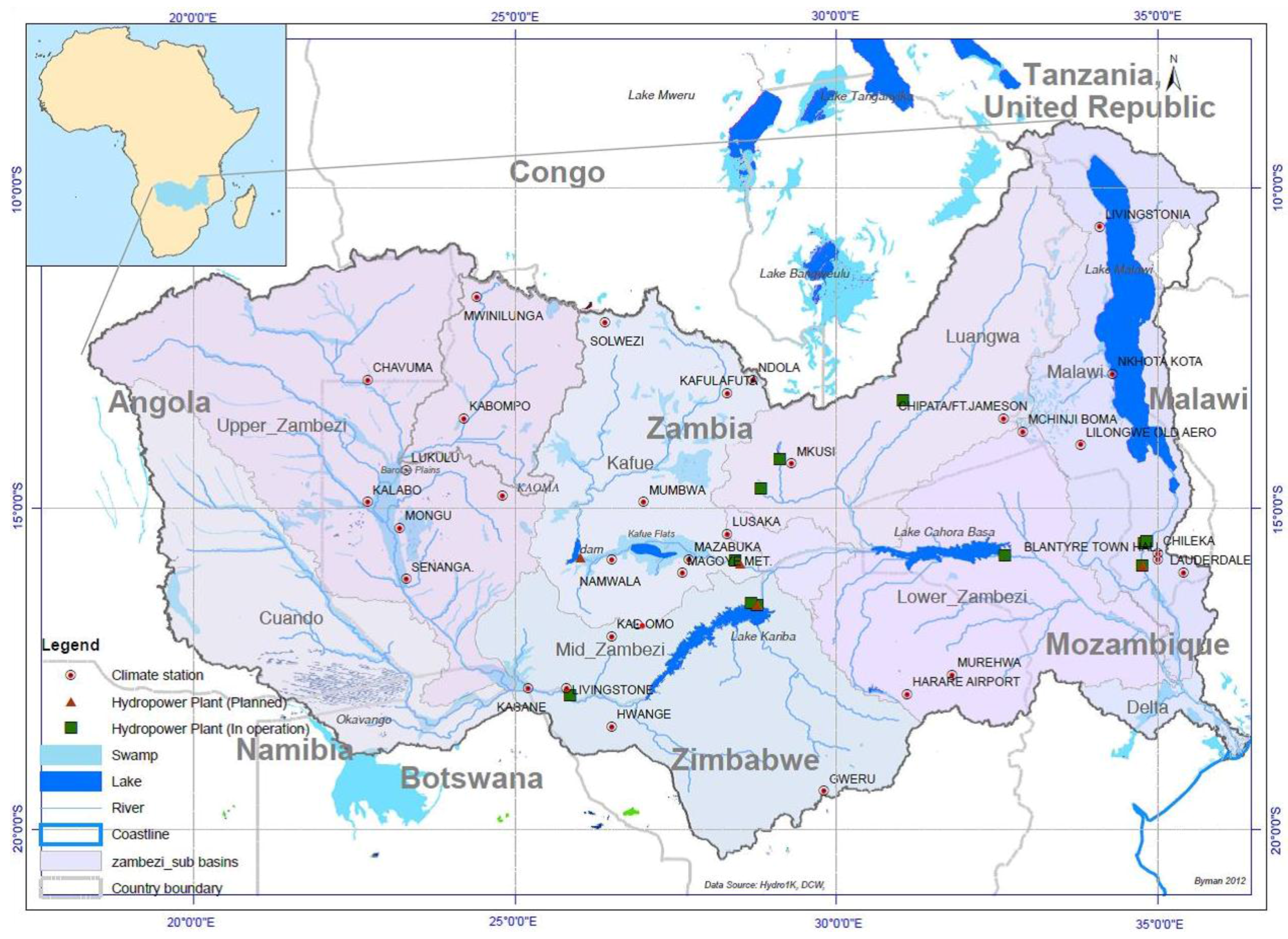 The hydrological description of the basin was derived based on Geographical Information systems (GIS) analysis of the basin. The data required was the basin area, sub basins, slope, and elevation zones among many parameters. Data for hydropower plants and their description was obtained from Zambia Electricity Supply Corporation (ZESCO), the electricity utility company in Zambia and from various reports. The hydropower system data required included reservoir size (area, volume), installed capacity, efficiency and other parameters.