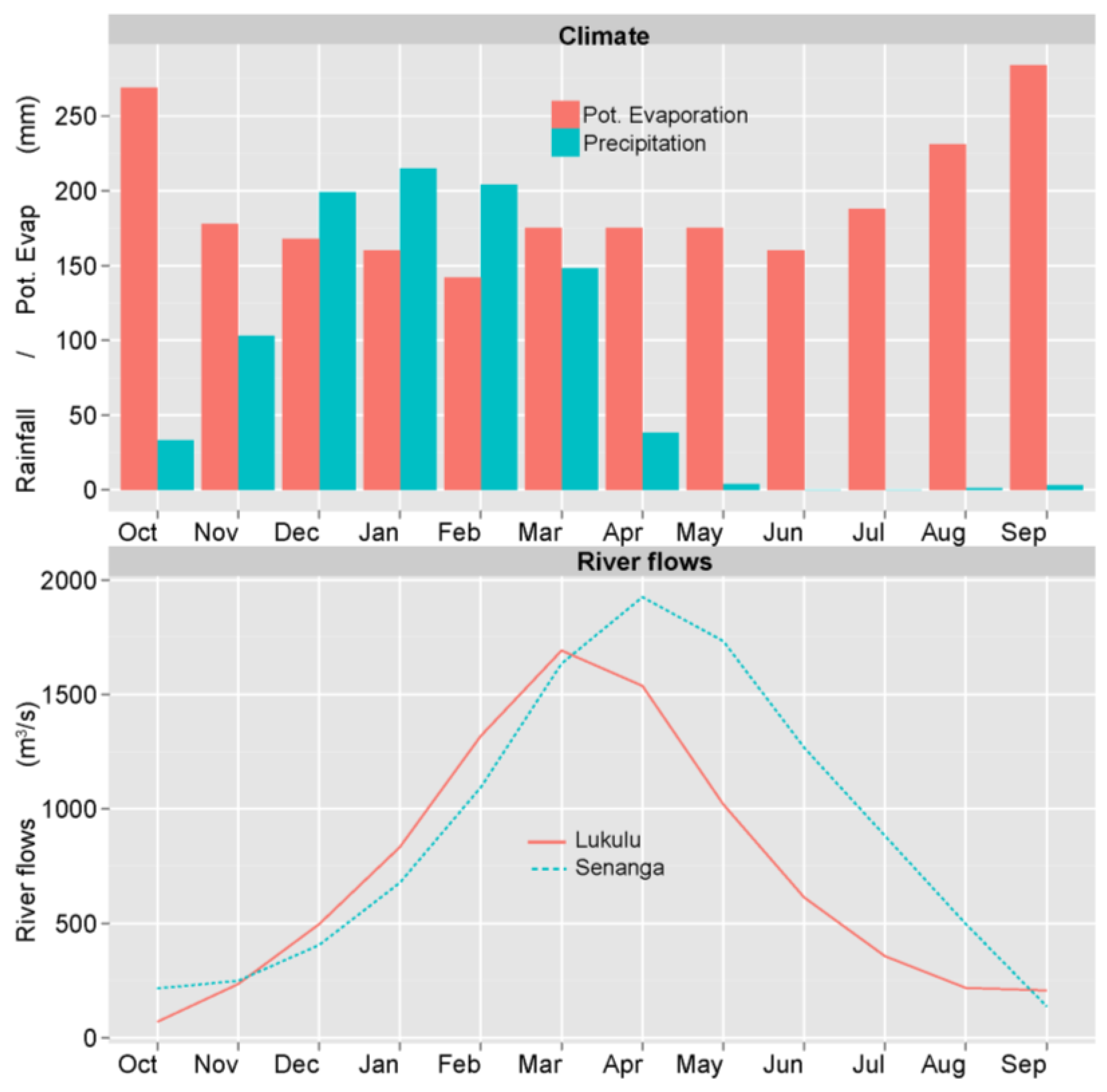 Climate and Hydrology in the Zambezi River Basin. The (top) is the mean monthly Rainfall and potential evaporation. The (bottom) plot is mean monthly runoff at Lukulu before the Barotse plains and Senanga after the Barotse plains, both are upstream of Victoria Falls.