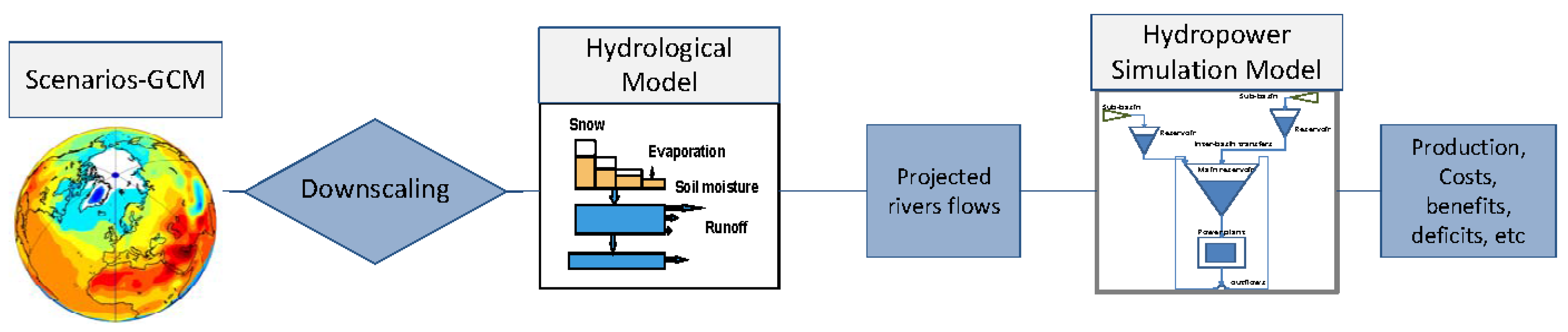 In order to analyze the impact of changed flows on hydropower productions, a model that describes the hydropower system is required to simulate the system with future flows. While it is sometimes tempting to assume that the changes in runoff directly relate to changes in hydropower production, this assumption should be used only in large (regional or global) areas analysis or run-of-river systems. However, where there is storage and other user demands it is necessary to carry hydropower simulations to ascertain the changes that may result from computed changes in runoff. Since the basins selected all have reservoirs with varying sizes, the hydropower production simulations were deemed necessary. In this case the results of the hydrological simulations (river flows) were inputs into the hydropower stimulations by an energy model. The energy model was used to highlight changes that are likely to occur given the changes in the river flows.