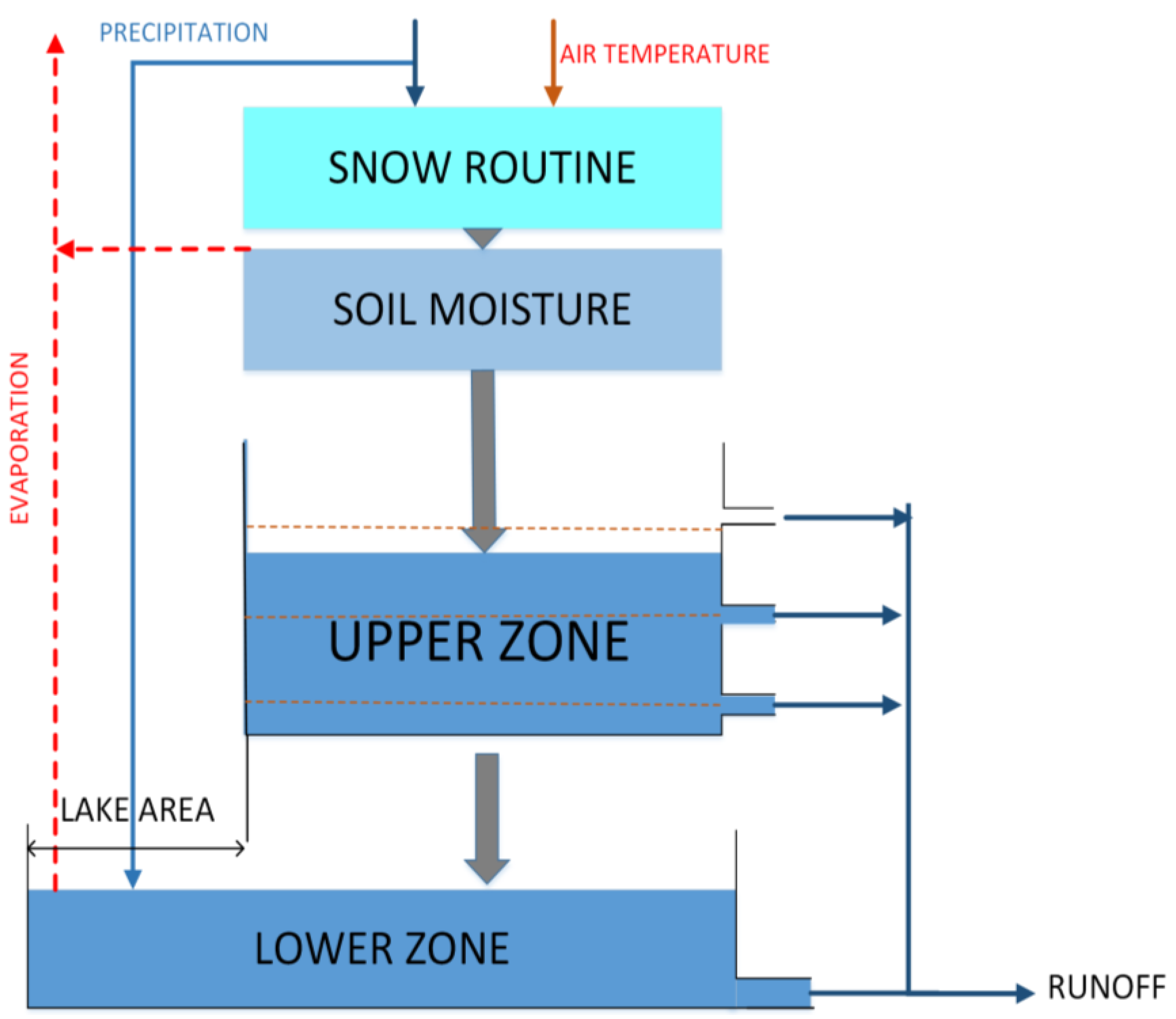 The HBV model was used for translating the climate scenarios, temperature, evaporation and precipitation, to hydrological changes. The HBV is a conceptual lumped rainfall runoff model originally developed for operational runoff forecasting [44,45]. It has also been used extensively to perform impact studies for climate change assessments [46]. The model, depicted in Figure 4 uses precipitation, air temperature and potential evaporation as input and is usually runs on a daily time-step. The model contains routines for snow accumulation and melt, soil moisture, and groundwater response. Potential evaporation was estimated based on temperature and precipitation series by the Hargreaves method, which is a modified Thornthwaite method [36,47,48].