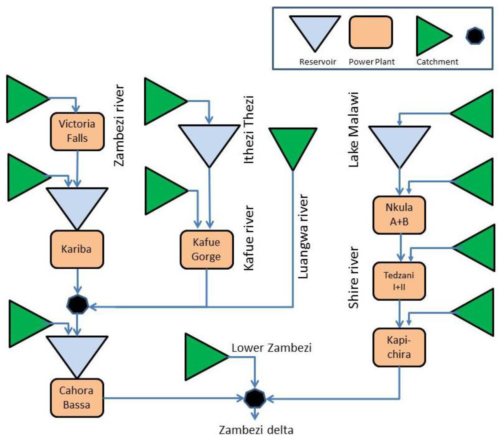 The hydropower facilities are listed in Table 2. At present, the basin has 4833 MW of installed hydropower generation capacity along the main trunk Zambezi River and the two main tributaries Kafue and Shire. In addition there are a few smaller hydropower plants not included in this analysis and in Table 2. Potential plans for additional power plants and upgrading or expansion shows that the current average hydropower production of 31,598 GWh/year could be increased.