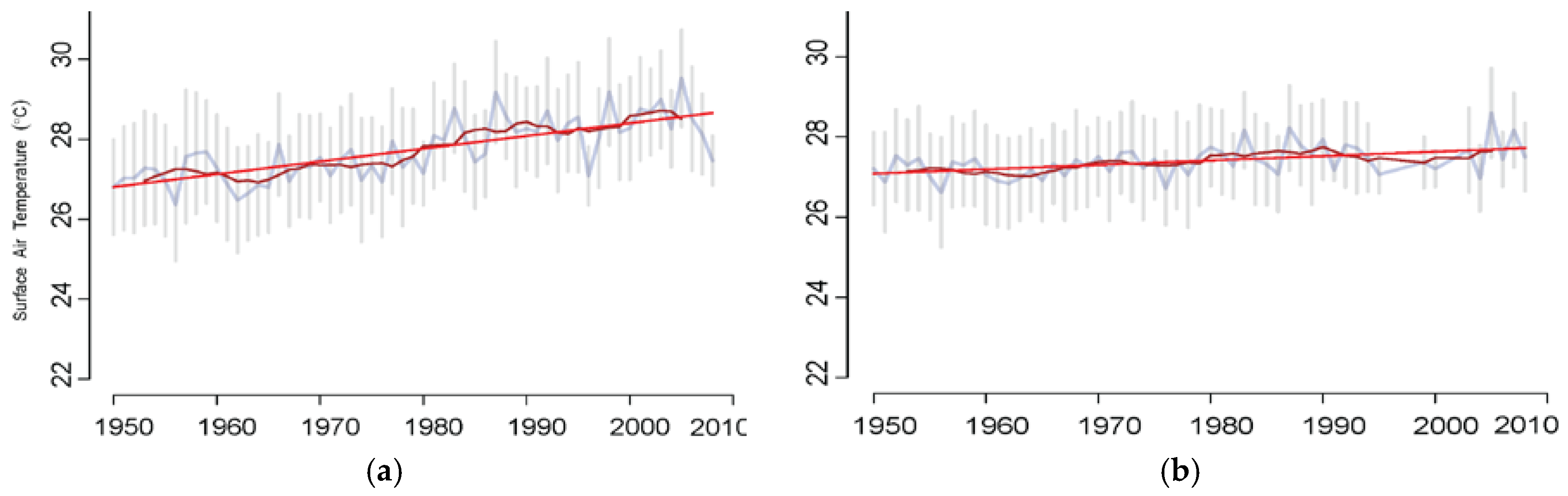 Observed trends (1950–2010) in observed annual maximum temperature at two climate stations within the Zambezi Basin: Mongu (a) and Mwinilunga (b). The y–axis is the temperature in degree Celsius (°C). The brown line represents the 5-year moving average while the red line is the simple linear trend line.