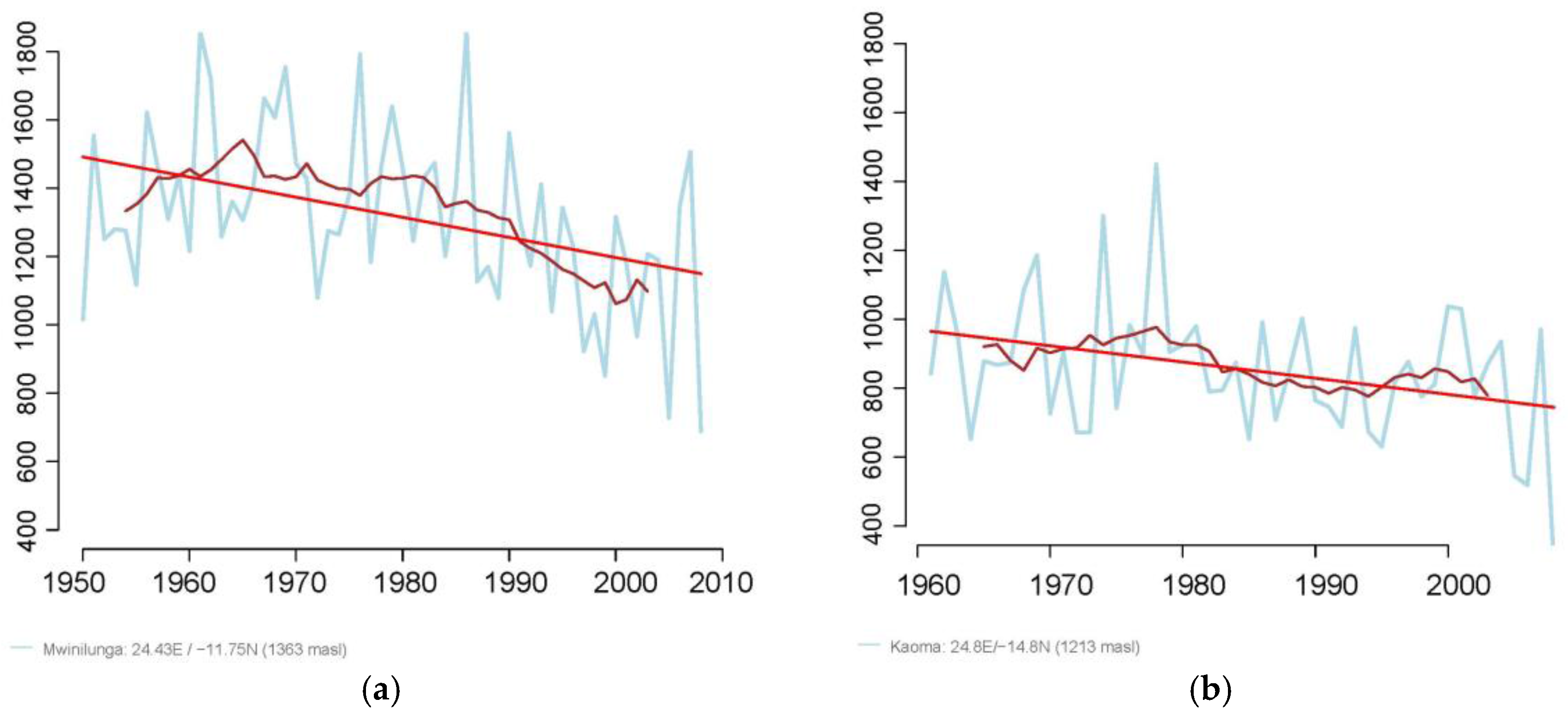 Observed trends (1950–2010) in annual rainfall at two of the climate stations within the Zambezi Basin, Mwinilunga (a) and Kaoma (b). The y–axis is the annual rainfall in mm. The brown line represents the 5-years moving average while the red line is the simple linear trend line.