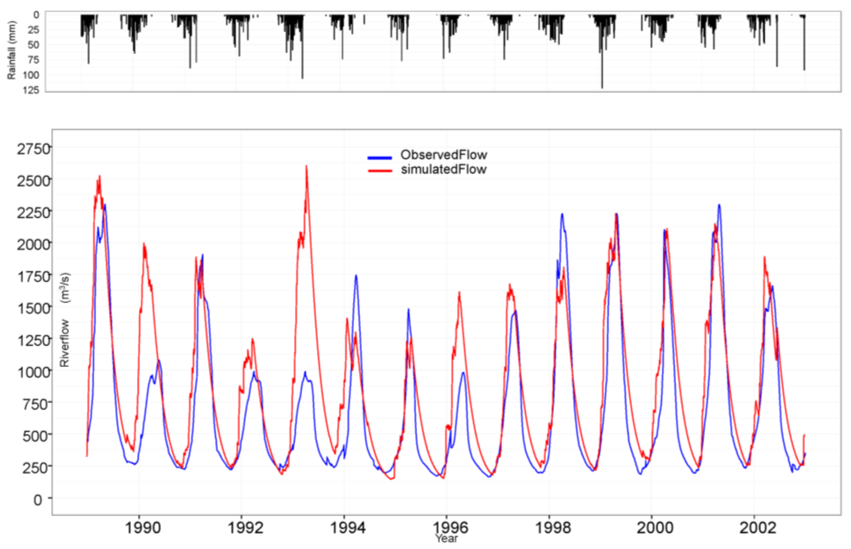 The hydrological model calibration was assessed by a combination of manual and numerical criteria, using plots of observed and simulated flows, together with Nash-Sutcliffe R2 parameter corrected for water balance deviation. The observed runoff at Victoria Falls (pump station) was used for this calibration for the period from 1989 to 2002 which had reasonable daily data coverage for both the runoff and rainfall and temperature. Optimal model parameters were determined by automatic model calibration, see Table 6 for the final parameters. Some model calibration result for Zambezi at Victoria Falls is shown in Figure 8. The average R2 value is 0.78 for the entire calibration period with accumulated volume difference of −11 mm, we consider this to be a reasonable good fit, see Table 6.
