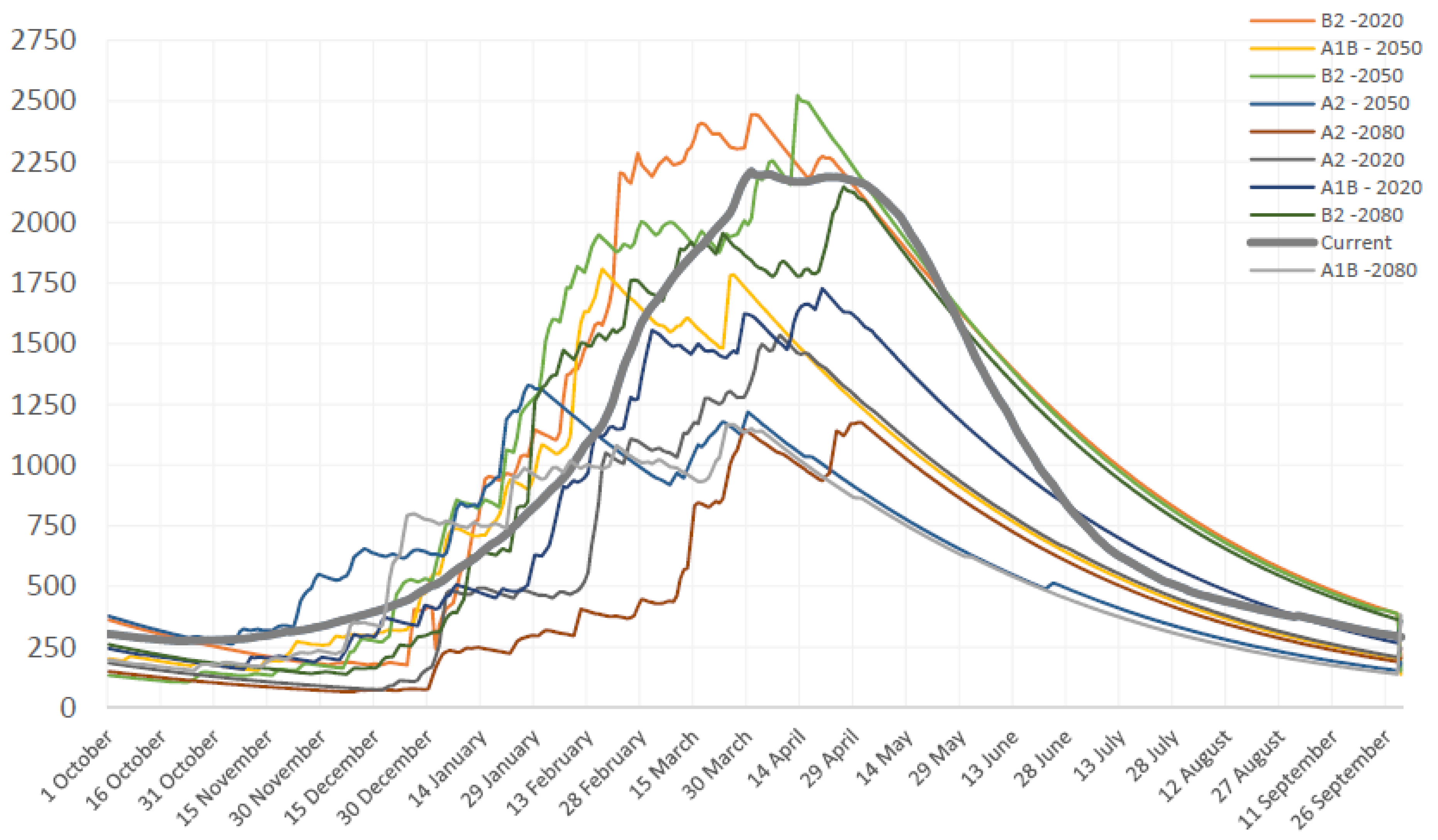 Average annual flow regimes in Zambezi River at Victoria Falls gauging station for the reference period 1961–1990 and for projected future periods for different emission scenarios. The y axis is flow in m3/s.