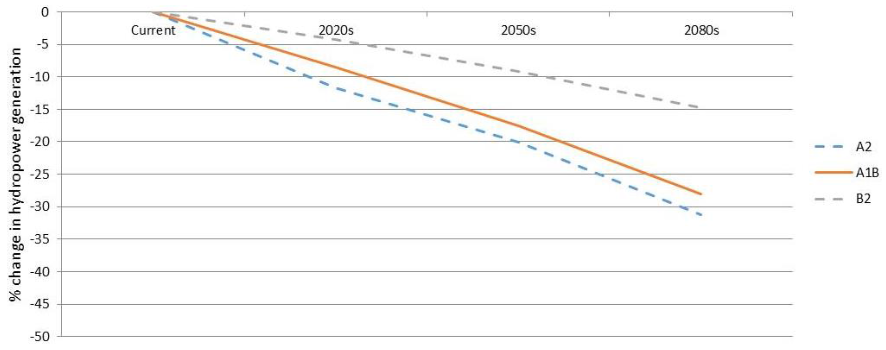 As can be seen in Table 8, the expected changes in the Zambezi hydropower system varies somewhat depending on the choice of time and emission scenario used. Using the A1B (middle) emission scenario, the current production levels are likely to be reduced by 9% by 2020s, 18% by 2050s and 28% by the 2080s. Figure 10 highlights these variations in changes depending on the choice of scenario. Using the A2 (“aggressive”) emission scenario, the current production levels are likely to be reduced by 12% by 2020s, 20% by 2050s and 31% by the 2080s. The reductions can be attributed to reduced rainfall amounts and increased evaporation, resulting in reduced runoff and increased evaporation losses in the reservoirs. The installation of more reservoirs for new hydropower plants in the future may even reduce more runoff [52,53].