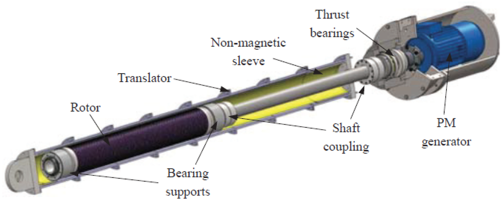 - Baker, N.J.; Mueller, M.; Spooner, E. Permanent magnet air-cored tubular linear generator for marine energy converters. In Proceedings of the Second International Conference on Power Electronics, Machines and Drives, Edinburgh, UK, 31 March–2 April 2004; Volume 2, pp. 862–867.