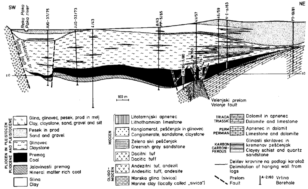 The geological setting of the VCM after previous research by Brezigar [3] is presented on Figure 2. The coal is of Pliocene age. The layer has a synclinal shape in all directions. The southeastern part of the coal layer is tectonically damaged. The base of the coal layer consists of Triassic dolomite in the northern part and of Oligocene and Miocene layers in the central and southern part of the coal-bearing depression. The depression is filled with clastic sediments, which transform from clay and coal-clay layers to thick coal layer. The overburden of the coal layer is represented by lacustrian clastic sediments [1,2,3].