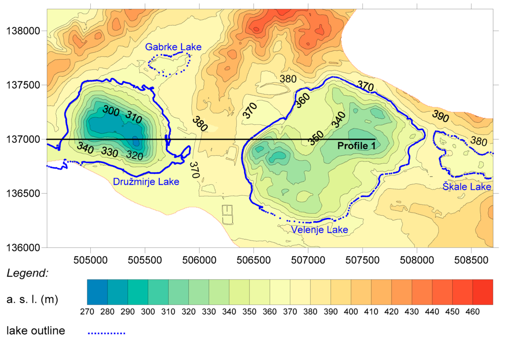 All research is led by VCM’s Hydrogeological Service. Previous research in the broader area of the coal mine included detailed geological mapping and exploration drilling. Veber [1] reported that with different drilling dynamics over different time periods and for different purposes, more than 600 surface boreholes with a total length of over 200 km and about 2000 cave boreholes with more than 100 km in length were drilled to date [2]. Also data about seismic events and their effects on the surrounding area of excavations were collected. Altogether the Hydrogeological Service of the VCM provided data about the coal layer, excavation works, surface subsidence and bathymetry of lakes, data of hanging wall and footwall occurrence, and data of coal burst source locations. These data sets were combined and used together with the DEM for a construction of a 2.5D visualization of layers and coal burst source locations in the VCM. For the data analysis and processing and for 2.5D visualization of data software packages Surfer®12 and Voxler®3 were used.