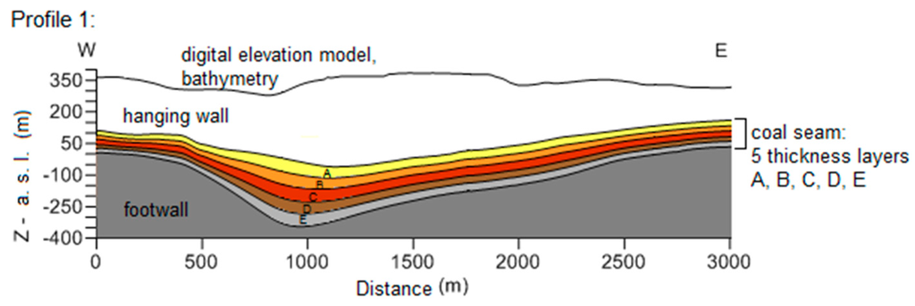 In the displays and 2.5D visualizations the coal seam is divided into five layers of thickness and the location and depth of excavation works are presented in Figure 7. Most of the excavations were carried out in the upper 40% of the coal seam thickness, and only the deepest excavations in the western part of the depression were made in the upper 60% of the coal seam thickness.