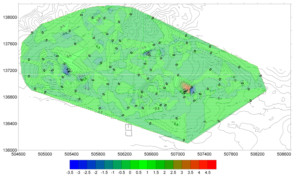 Residual values of KRG interpolation method for gridding ash content in layer C. Residual values are gridded with triangulation with linear interpolation method and are projected over surface contour map.