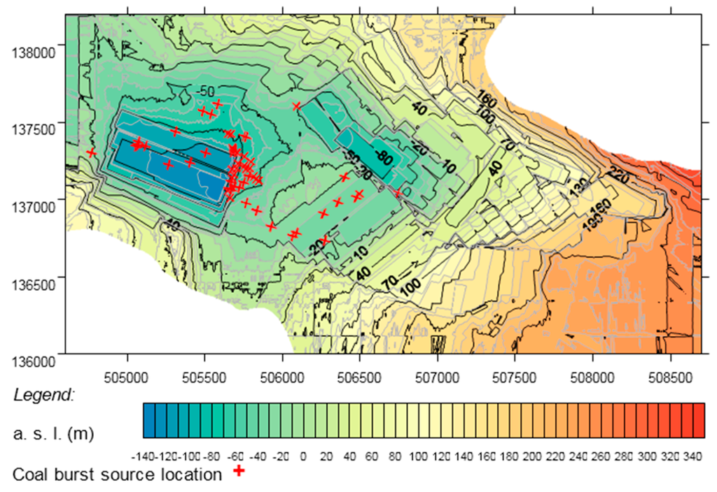 The scope and the intensity of coal extraction have an impact on stress and deformation of the coal seam and adjacent rocks in the broader excavation area. Despite analysis of the stress-strain distribution around the mining longwall face and monitoring system for seismic events, unpredictable bursts of coal and the surrounding rocks continue to be threats to safety. In underground coal mines a type of a rockburst is a violent failure of coal or a coal burst. A rockburst is a mining-induced seismic event that causes damage to excavations [6,7,8]. Rockbursts can cause sound effects, disruption of a support system, destruction of equipment, and the formation of dust and air waves, which cause work stoppages and also affect the quality of life in nearby villages on the surface. Because of the large thickness of the coal layer in the VCM and mining work situated within the coal layer, the most common mining-induced event is a mechanical failure of a coal layer itself—a coal burst. In spite of modern technology and preliminary security measures coal bursts cannot yet be foreseen. To determine the approximate locations of coal bursts and the type of a mechanical failure of coal, visualization of the geological and mining situation in the VCM was made with data-visualization packages Surfer®12 and Voxler®3 [9,10].