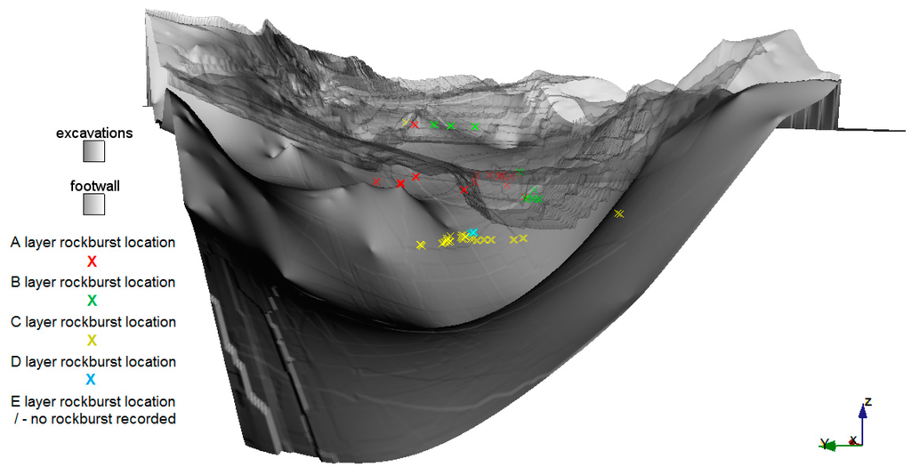 In the following visualizations of general situation of layers and coal burst source locations in the VCM the height component Z is emphasized by two-fold to improve transparency. Displays are oriented in the NW-SE direction, from the deepest parts to the shallower parts of the coal basin (Figure 8).