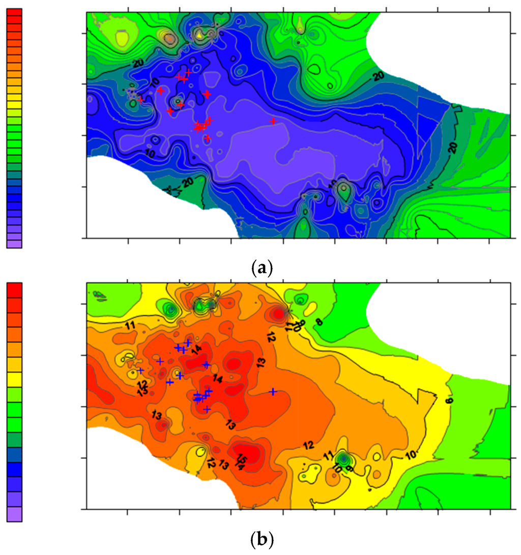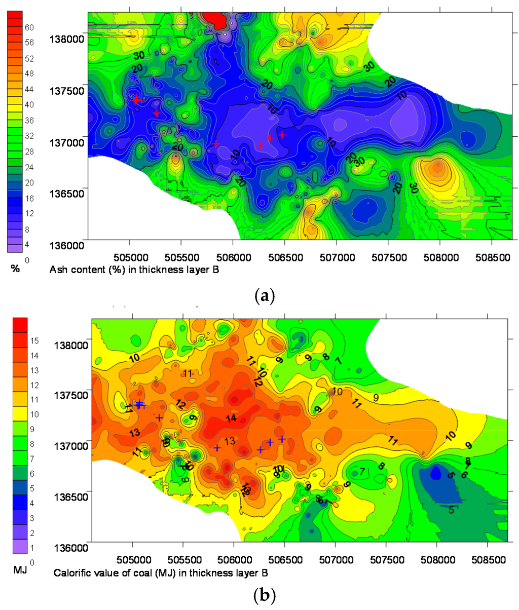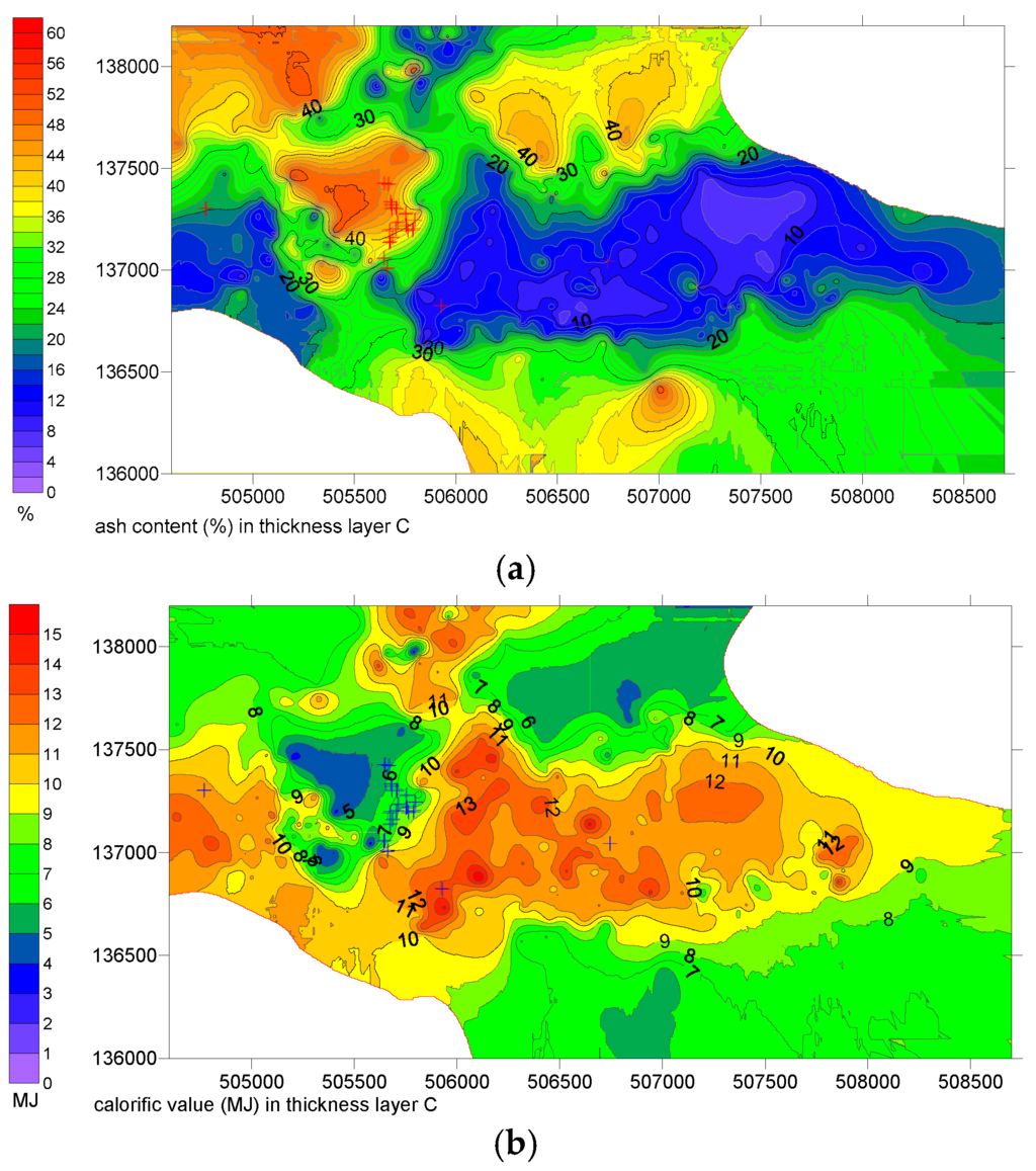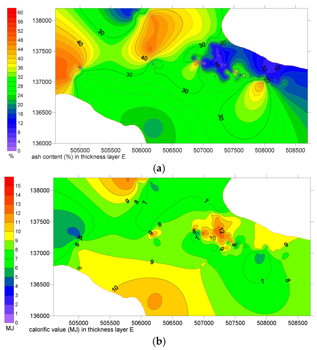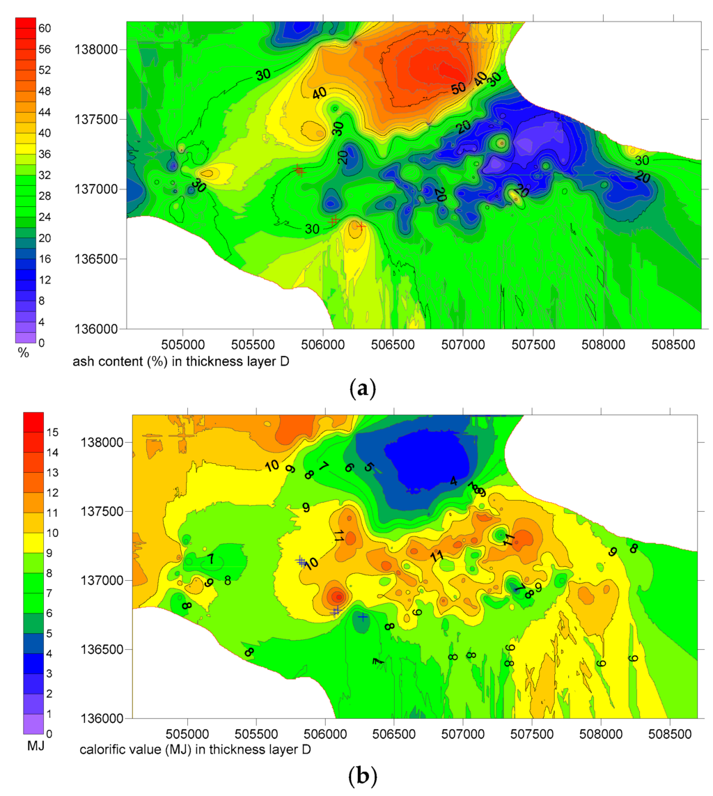 Therefore, for 2.5D visualization of uniform geological structures and geotechnical parameters of the coal seam, KRG interpolation method with default settings was selected. However, values of geotechnical parameters of coal are reliable only in the central and north-eastern part of the studied area of the VCM, where sufficient number of coal samples was taken and residual values for selected KRG are minimal (Figure 5).